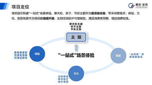 基于以上調(diào)查結(jié)果,我們將項(xiàng)目的定位確定為一個(gè)“一站式”場景體驗(yàn)項(xiàng)目,集購物、餐飲、娛樂、文化藝術(shù)、親子活動(dòng)和自然風(fēng)光于一體的綜合體。項(xiàng)目的目標(biāo)消費(fèi)群體是5-15歲兒童以及喜歡探索和享受時(shí)尚潮流的年輕人群。通過提供獨(dú)特的主題場景(摩天輪主題、親子主題、節(jié)慶主題)、精彩紛呈的體驗(yàn)型娛樂(體驗(yàn)型餐飲、沉浸式運(yùn)動(dòng)、沉浸式娛樂)、豐富多樣的文化藝術(shù)場景(當(dāng)?shù)孛朗?、城市展廳、城市書房)以及極致的山海城景色融合,為消費(fèi)者打造一個(gè)充滿活力和魅力的商業(yè)文旅目的地。
