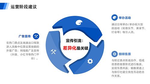 (1)宣傳引流定位為差異化。通過精準(zhǔn)的市場定位和針對性的宣傳策略,突出項(xiàng)目與眾不同的特點(diǎn)和獨(dú)特的文化價(jià)值,以吸引目標(biāo)消費(fèi)人群的注意力。同時(shí)充分利用社交媒體、線上線下廣告等多種渠道進(jìn)行宣傳,展示項(xiàng)目的獨(dú)特之處,并積極與潛在客戶互動(dòng),提升品牌影響力和口碑。另外與周邊景點(diǎn)、酒店建立合作,提供一攬子的交通+住宿+游玩服務(wù),提高整體的便利性和滿意度。