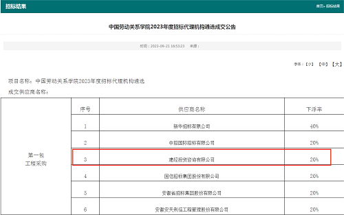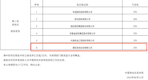 近日,中國勞動關(guān)系學(xué)院2023年度招標(biāo)代理機(jī)構(gòu)遴選項(xiàng)目成交公告發(fā)布,我公司成功入選中國勞動關(guān)系學(xué)院2023年度招標(biāo)代理機(jī)構(gòu)(第一包工程和第二包貨物及服務(wù))。