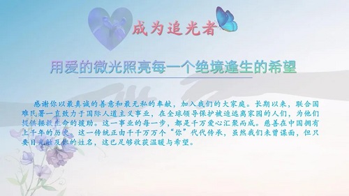 愛,無(wú)論膚色,無(wú)論國(guó)界,在國(guó)際婦女慶典活動(dòng)最后,公司號(hào)召所有建經(jīng)人成為追光者,用愛的微光照亮每一個(gè)絕境逢生的希望,倡議大家積極參與由聯(lián)合國(guó)難民署、中國(guó)紅十字基金會(huì)發(fā)起的國(guó)際難民募捐活動(dòng)。