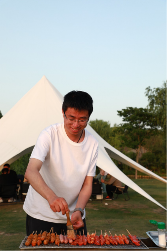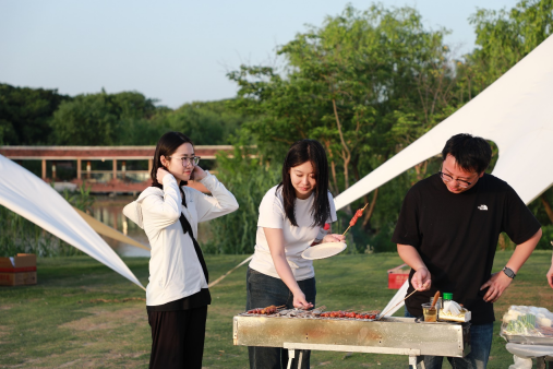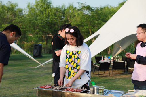 夕陽(yáng)西下,團(tuán)員們?cè)趹敉馓炷幌鹿蚕頍咀灾聿?。團(tuán)員們各司其職,踴躍參與烹飪,展現(xiàn)高超廚藝,現(xiàn)場(chǎng)還舉行了烹飪大賽,評(píng)選出“美食廚王”。