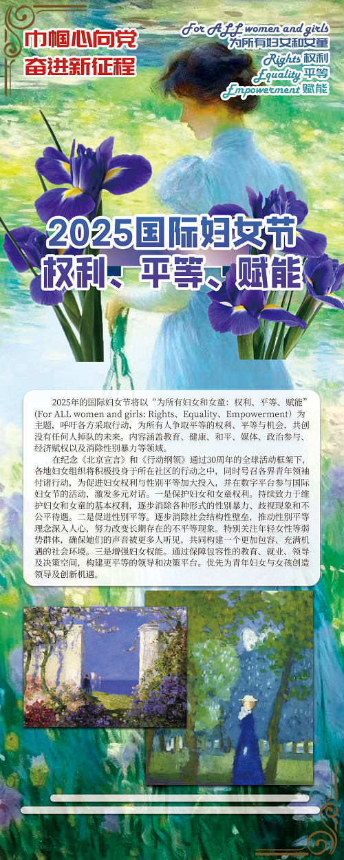 紅顏勝士多奇志,半邊天里寫春秋。作為社會發(fā)展的重要推動者,婦女始終是物質(zhì)與精神文明創(chuàng)造的脊梁;而“三八”國際婦女節(jié)這一全球性節(jié)日,凝聚著各國女性爭取公正、平等與可持續(xù)發(fā)展的高度共識。尤其在2025年——《北京宣言》通過30周年的歷史性節(jié)點,國際婦女節(jié)以“為所有婦女和女童:權(quán)利、平等、賦能”為主題,呼吁世界直面氣候危機與數(shù)字鴻溝等新型挑戰(zhàn),將性別平等推向更深層的結(jié)構(gòu)性改革。