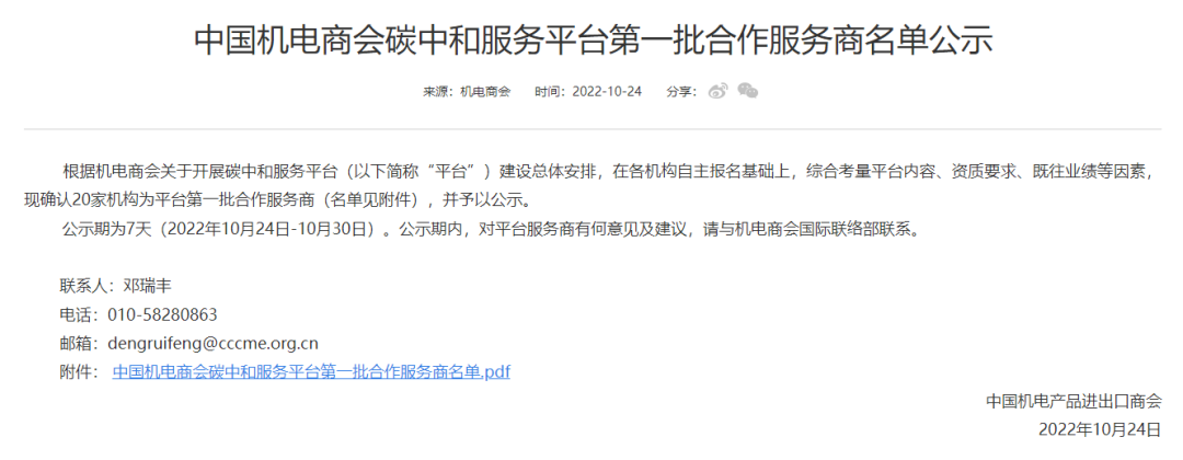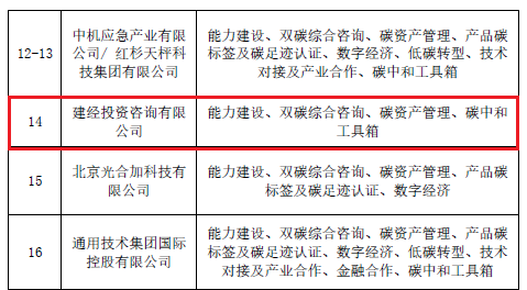 建經(jīng)投資咨詢有限公司于10月24日成功入選中國機電產(chǎn)品進(jìn)出口商會(CCCME)碳中和服務(wù)平臺第一批合作服務(wù)商名單。入選服務(wù)內(nèi)容為能力建設(shè)、雙碳綜合咨詢、碳資產(chǎn)管理、碳中和工具箱四個方面。